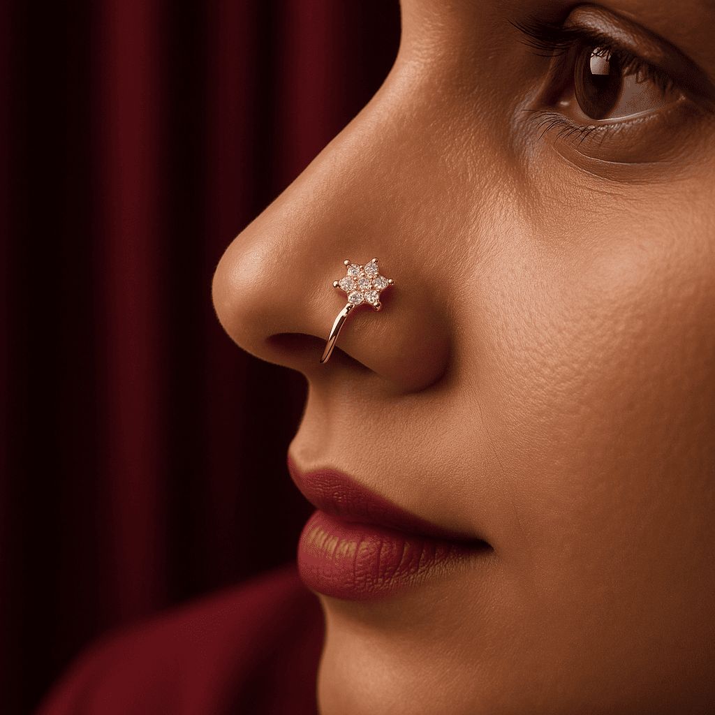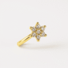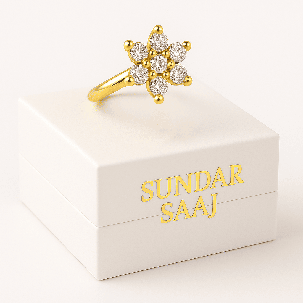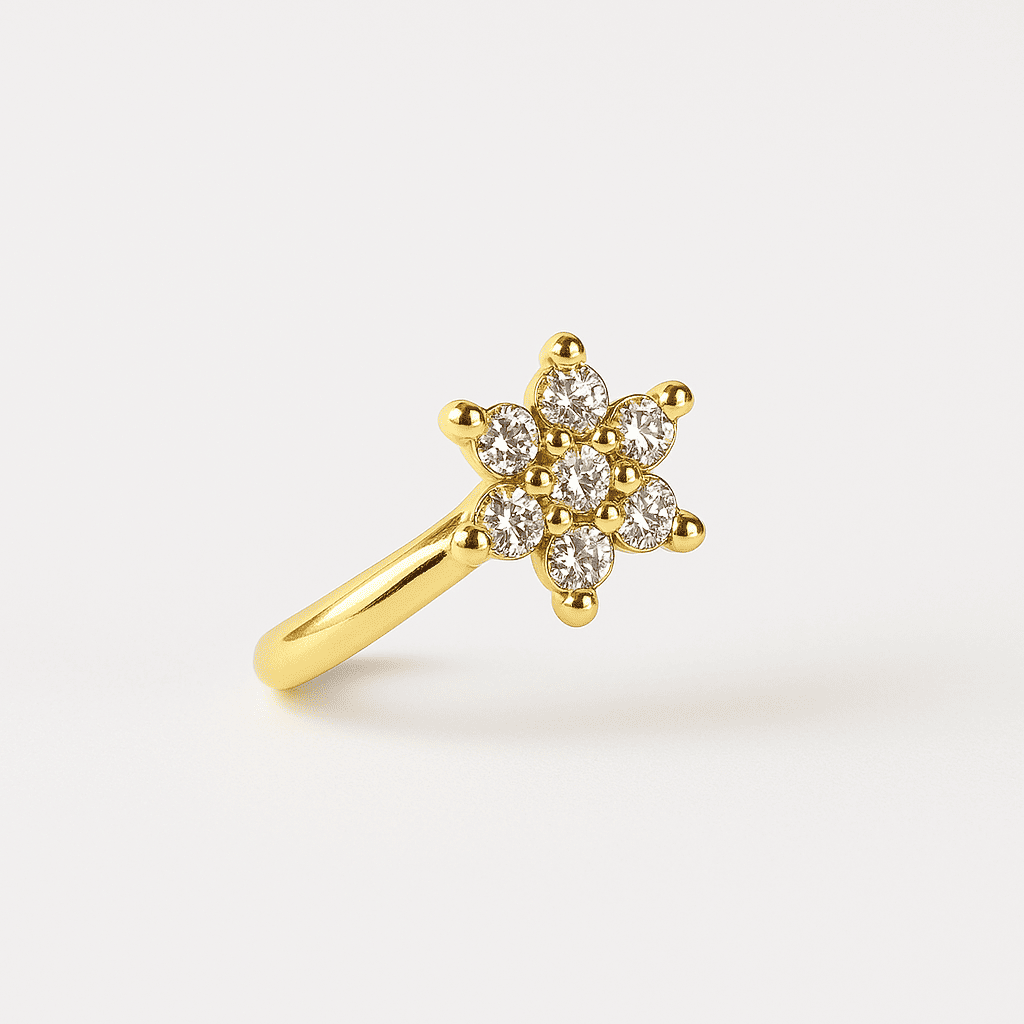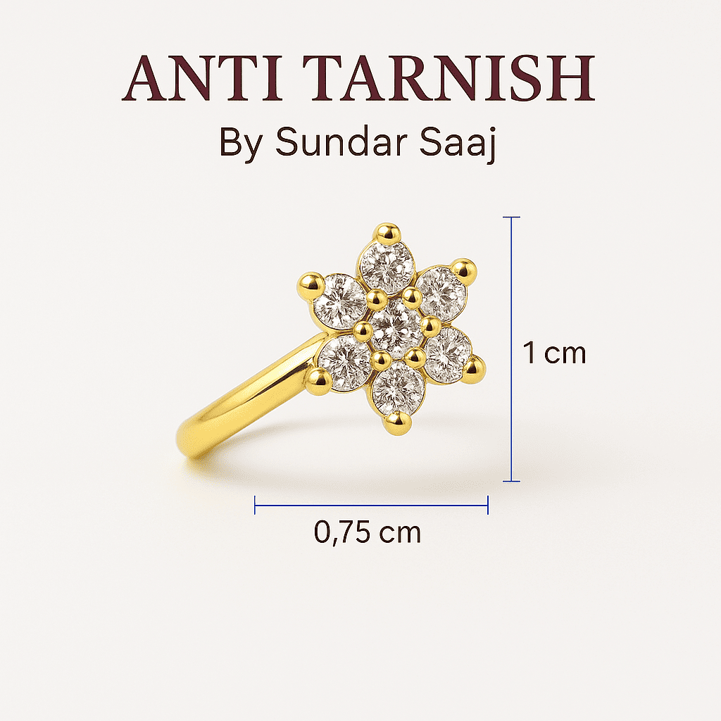 Delicate as a bloom, radiant like a moonlit night — this floral nose pin is a tribute to timeless beauty. With crystal-clear stones set in a perfect six-petal design, it catches light from every angle while sitting light on the skin. Crafted in a golden base with a skin-safe, anti-tarnish finish, it’s made to bloom on your face, day or night.