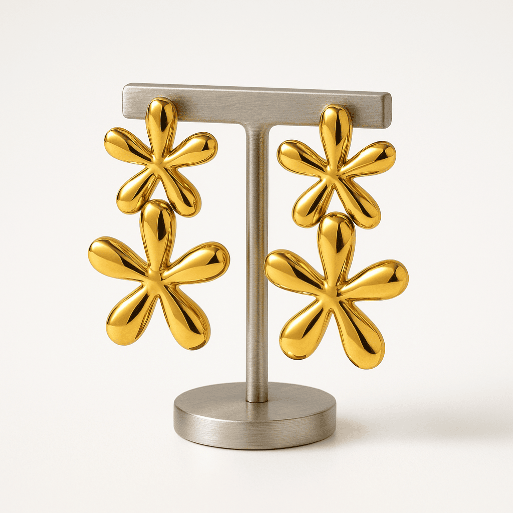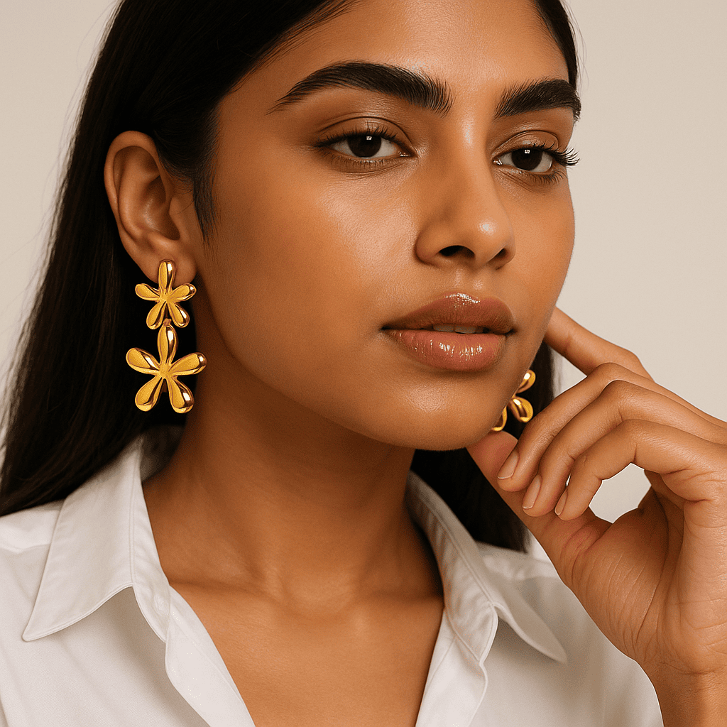 Delicately designed with twin floral layers, these earrings add a soft yet striking charm to your everyday elegance. Crafted in a radiant gold finish, they’re lightweight, skin-safe, and made to blossom with every outfit.