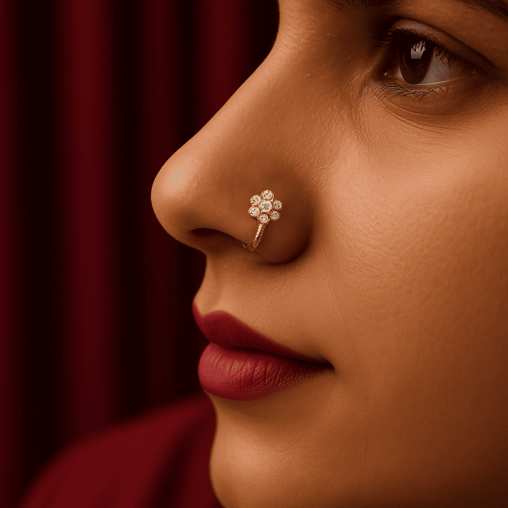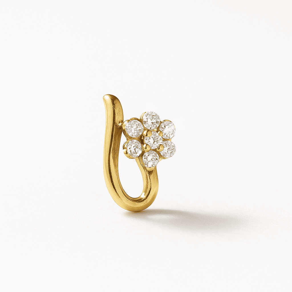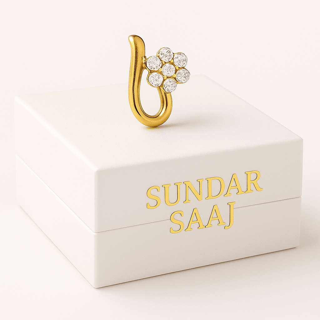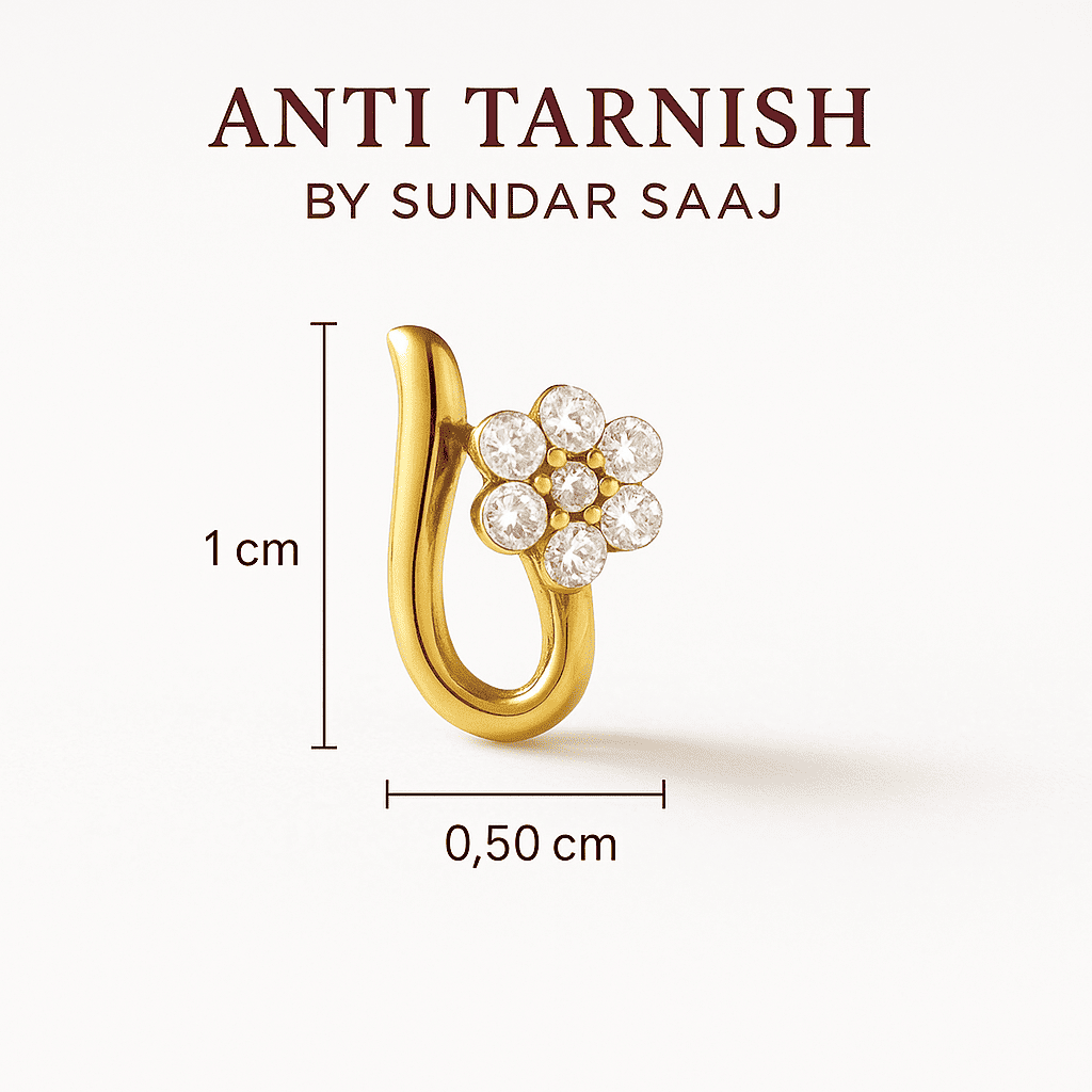 A gentle curve, a blooming sparkle — this nose pin is crafted to echo tradition with a twist. The golden swirl holds a delicate floral cluster of stones, adding both grace and uniqueness to your look. Designed with skin-safe, anti-tarnish material, it sits comfortably for daily wear yet shines bold enough for festive nights.