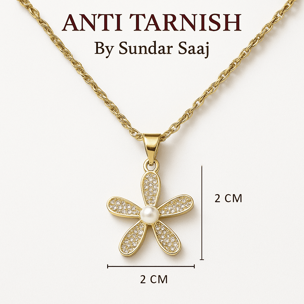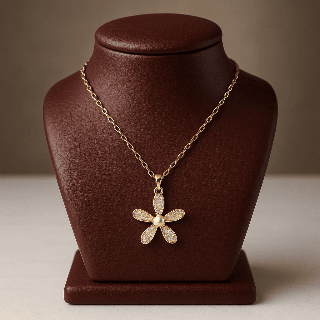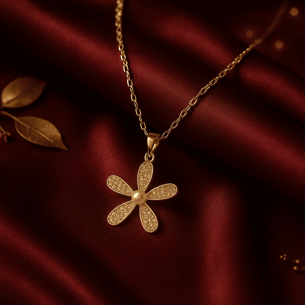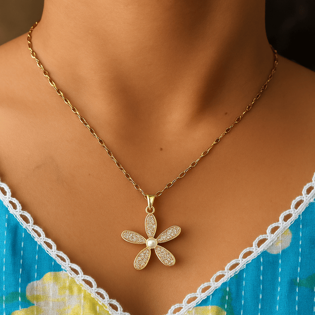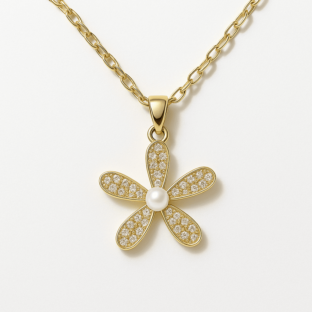 A delicate bloom kissed by shimmer, this pendant captures the quiet beauty of nature in full grace. Five pavé-studded petals surround a single lustrous pearl, suspended from a fine chain that dances with every movement.