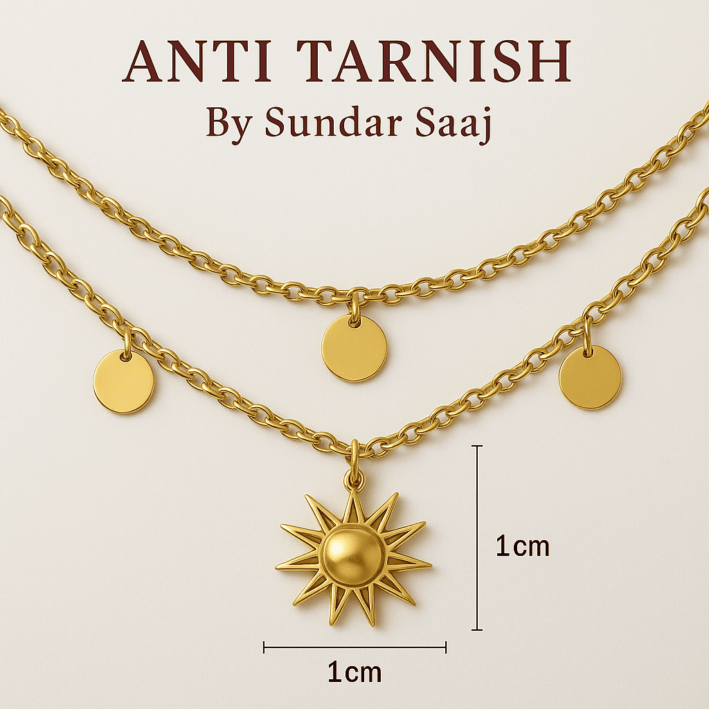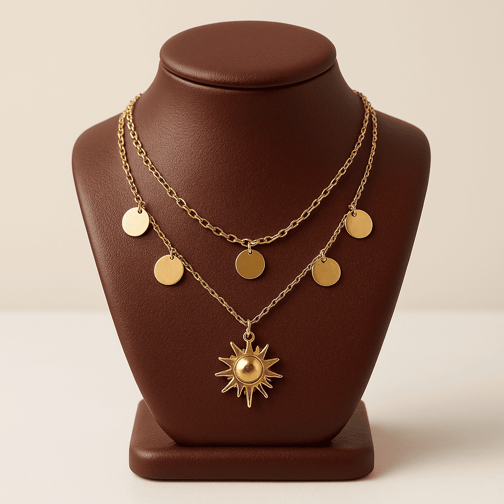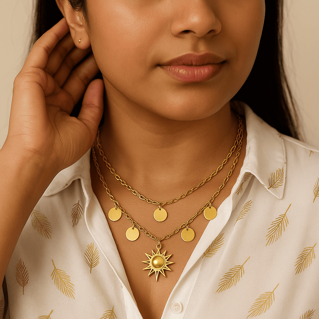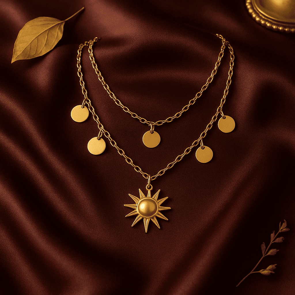 Sunlit Layers is a statement layered necklace that celebrates the radiance within you. Featuring delicate golden discs and a stunning sunburst pendant, this three-tiered beauty is a perfect fusion of tradition and trend. It dances with light, moves with you, and turns even the simplest look.