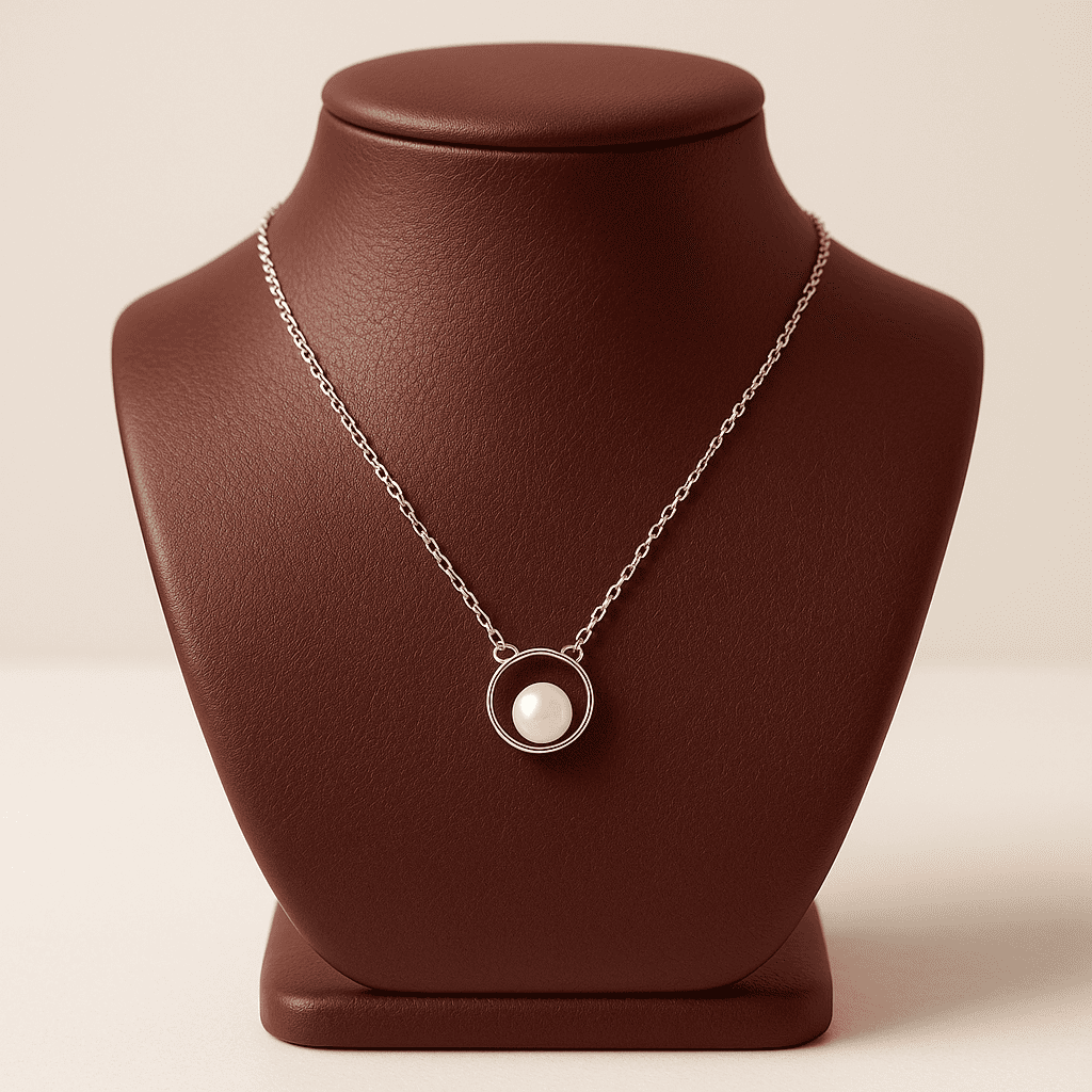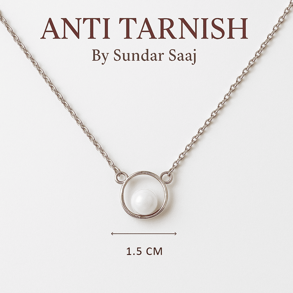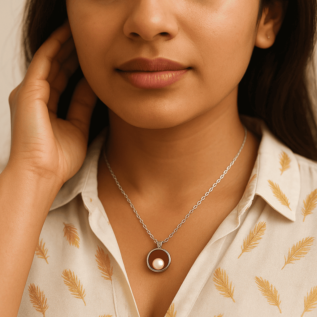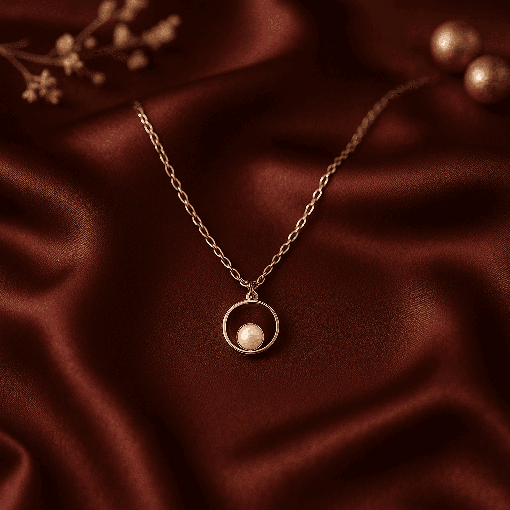 A timeless piece that speaks in whispers.Features a single blush-toned pearl cradled inside a delicate circular frame, suspended on a fine chain. The design celebrates balance, purity, and quiet grace. Crafted with anti-tarnish 18k gold plating, this necklace is perfect for women who love minimalism with meaning. Whether worn alone or layered, it adds a soft glow to everyday moments.